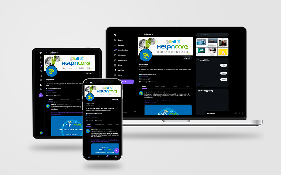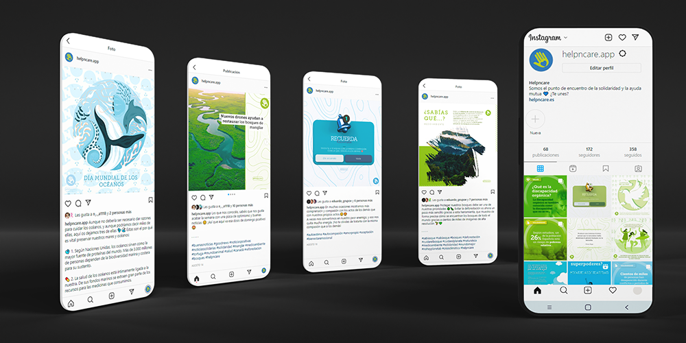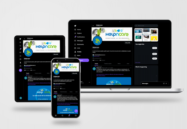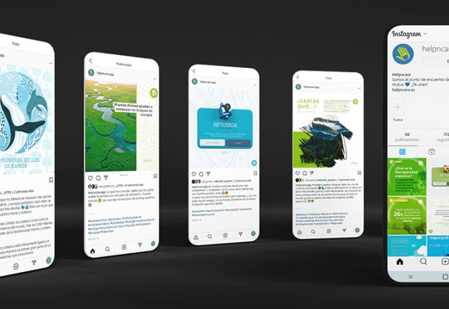 Gestión de Instagram, Facebook y X para la ONG Helpncare. Realización de creatividades y producción de material audiovisual, reels, stories, sorteos, gestión de la comunidad, dinamización y networking.